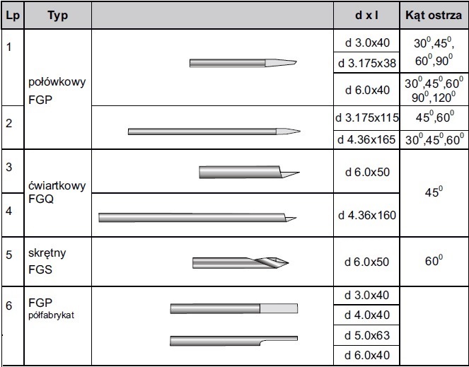 Inne wymiary, geometria ostrza – na zamówienie (min. 5 szt.). Przykład zamówienia: FGP d 3.0x40/600